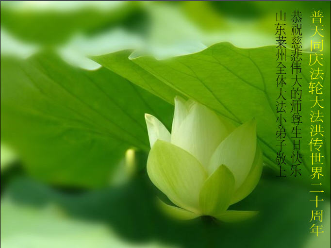 山东省烟台市莱州市全体大法小弟子恭祝慈悲伟大的师尊生日快乐!普天同庆法轮大法洪传世界二十周年!