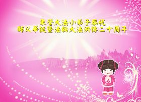 山东省东营大法小弟子恭祝慈悲伟大的师父华诞暨法轮大法洪传二十周年