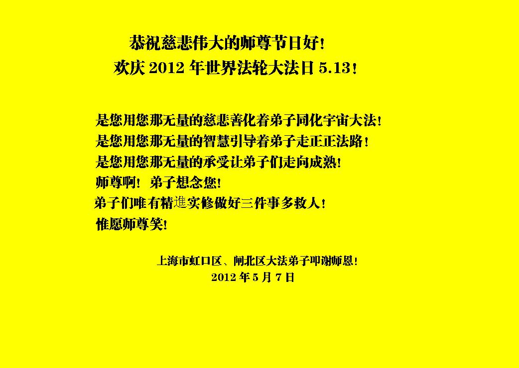 上海市虹口区、闸北区大法弟子恭祝慈悲伟大的师尊节日好!欢庆世界法轮大法日!