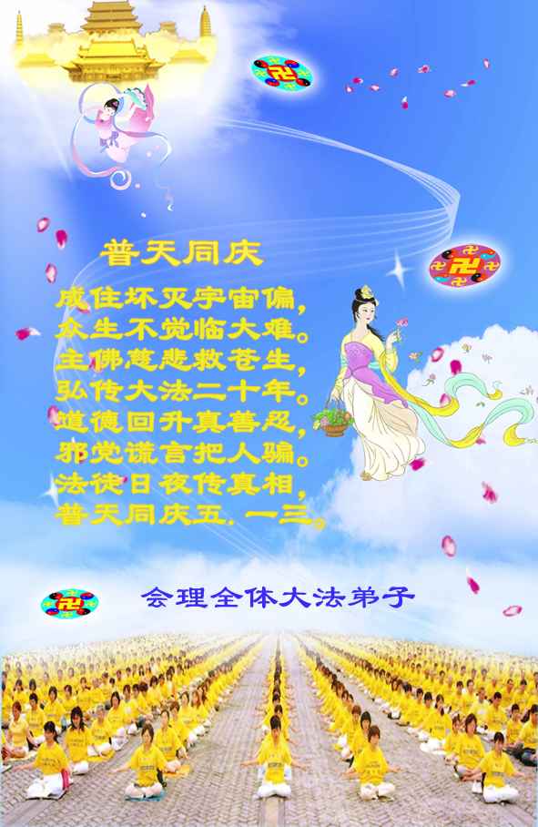 普天同庆 成住坏灭宇宙偏,众生不觉临大难。 主佛慈悲救苍生,洪传大法二十年。 道德回升真善忍,邪*党-谎言把人骗。 法徒日夜传真相,普天同庆五一三。 会理县全体大法弟子向伟大的师尊叩首:我们将继续做好三件事,实修自己,多救人,完成史前大愿,圆满随师还。 吉林省全体大法弟子贺师尊华诞暨世界法轮大法日!