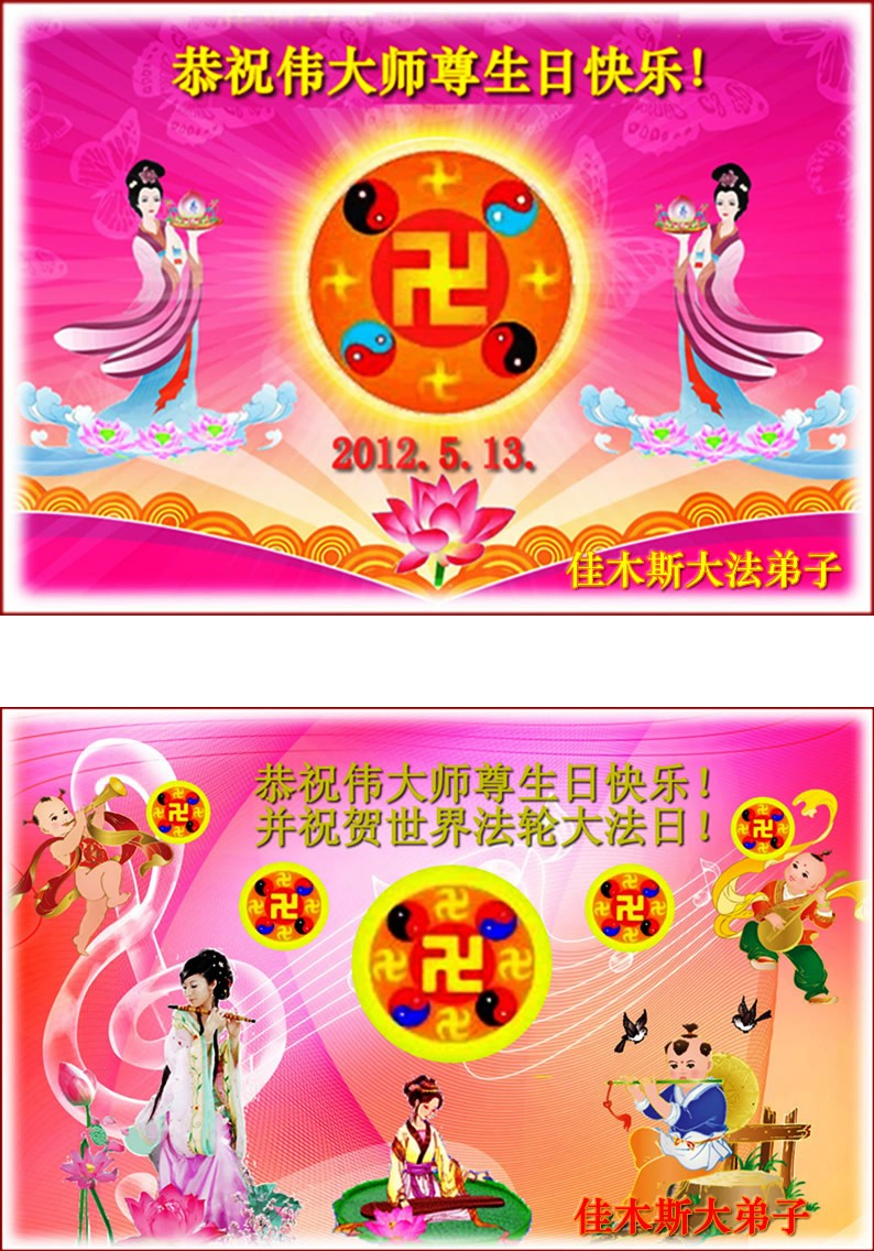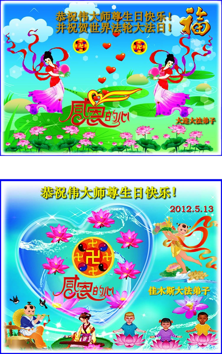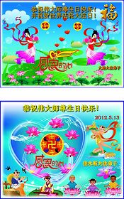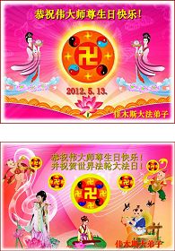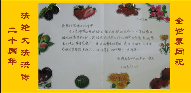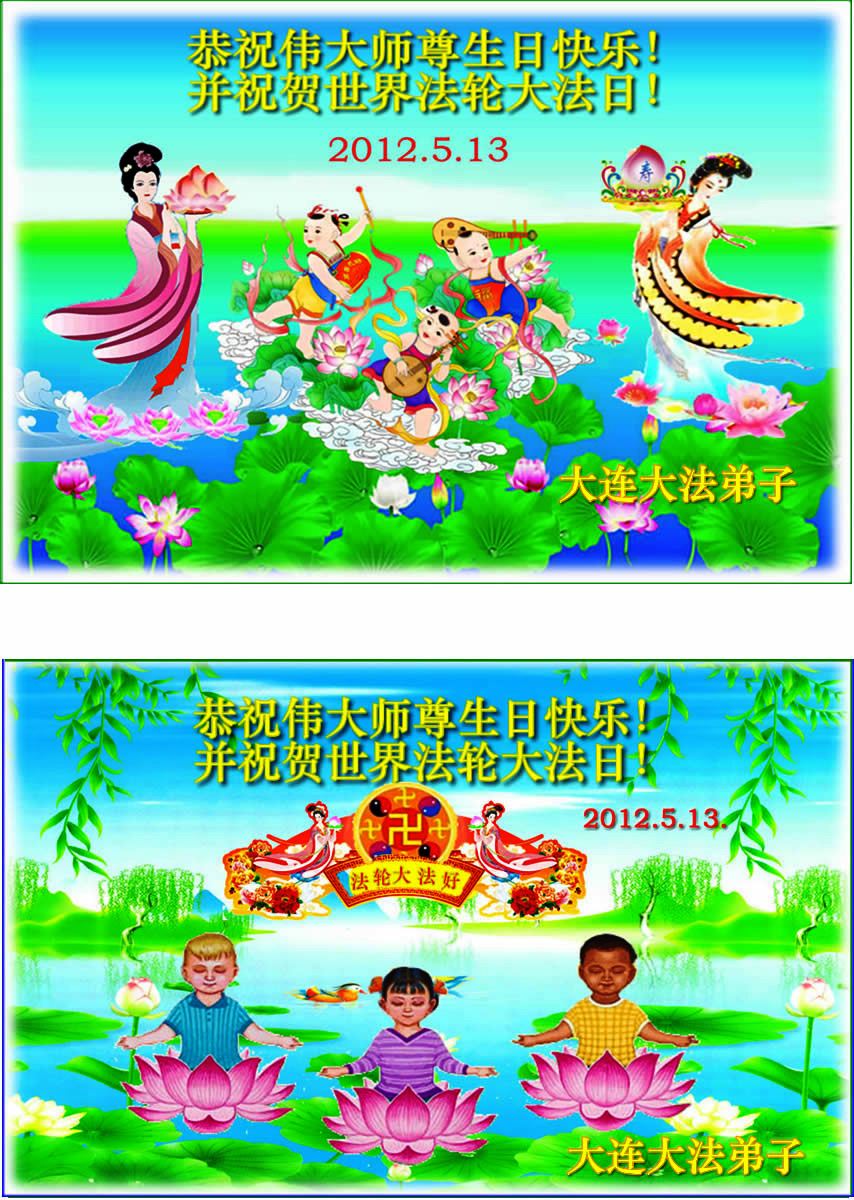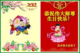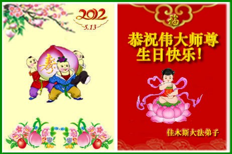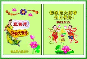 | 【明慧网二零一二年五月十二日】二十年前的五月,李洪志师父在中国长春将法轮大法公开传出于世,二十年后的今天,法轮大法洪传全球,亿万修炼者在大法“真善忍”的指导下道德升华,获得身心健康。十三年来,每年的五月十三日,世界各地的法轮大法弟子,都向明慧网寄来贺卡贺词,庆祝“世界法轮大法日”,恭贺师尊华诞。这里是明慧编辑部已整理出来的部份来自中国大陆大法弟子的贺卡、贺信。