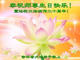 祝贺法轮大法洪传二十周年!庆祝世界法轮大法日! 辽宁省沈阳大法弟子恭祝师尊生日快乐!庆贺大法洪传20周年!