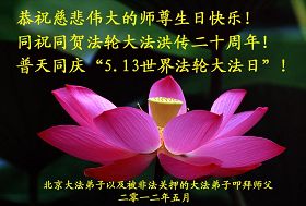 北京大法弟子恭祝伟大慈悲的师尊生日快乐!恭贺5.13世界法轮大法日!