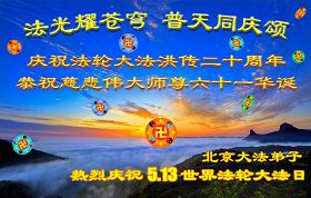 北京大法弟子恭贺五一三世界法轮大法日!恭贺慈悲伟大的师尊洪传法轮大法二十周年!