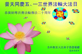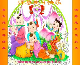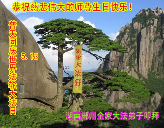 值此法轮大法洪传二十周年之际,谨代表本地区向慈悲伟大的师尊表示最真诚、最亲切的问候!同时也盼望师尊早日回家!内心的喜悦、激动和对师恩的感激、叩谢无以言表!二十年来伟大的师尊对弟子无微不至、无所不在的呵护与帮助,带着弟子一次又一次的走过魔难、度过艰险……此时此刻,回首修炼往事,真是百感交集,千言万语也无法表达弟子对师尊的感恩。唯有遵循师尊教诲。“我们为着众生而来,助师正法何惧下苦海”。二十年来我们更加明确弟子对师尊的不仅仅是感激、感恩,更多的是要把师尊的艰苦付出作为动力,勇猛精進,回报师恩。以救度众生为己任,抓紧时间推广神韵,彻底解体阻碍众生得救的根本因素。在最后的正法路上,拿出最好、最精進的状态来,不放松自己的一思一念,持之以恒,坚持到最后,不负“正法时期大法弟子”的伟大称号! 黑龙江大法弟子 湖南郴州青年大法弟子恭祝慈悲伟大的师尊生日快乐