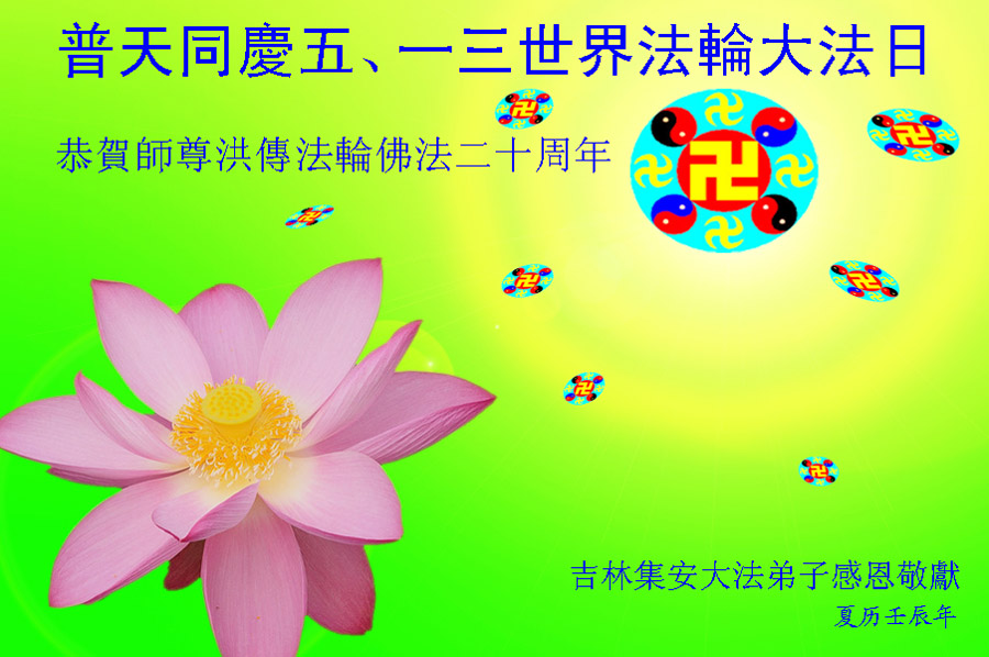 热烈祝贺法轮大法洪传二十周年!大法洪传,人心向善,身心健康!佛光普照,心归圣源。 5.13是大法洪传二十周年暨师尊佛诞盛庆,我叩拜慈悲、伟大的师尊生日愉快!身体健康! 我只有向内找放下执着,做好三件事,踏踏实实修炼恭迎伟大师尊早日回家乡!我们无比无比想念师父! 大陆大法弟子 合十 二零一二年四月十五日 天津大法弟子恭贺法轮大法日
