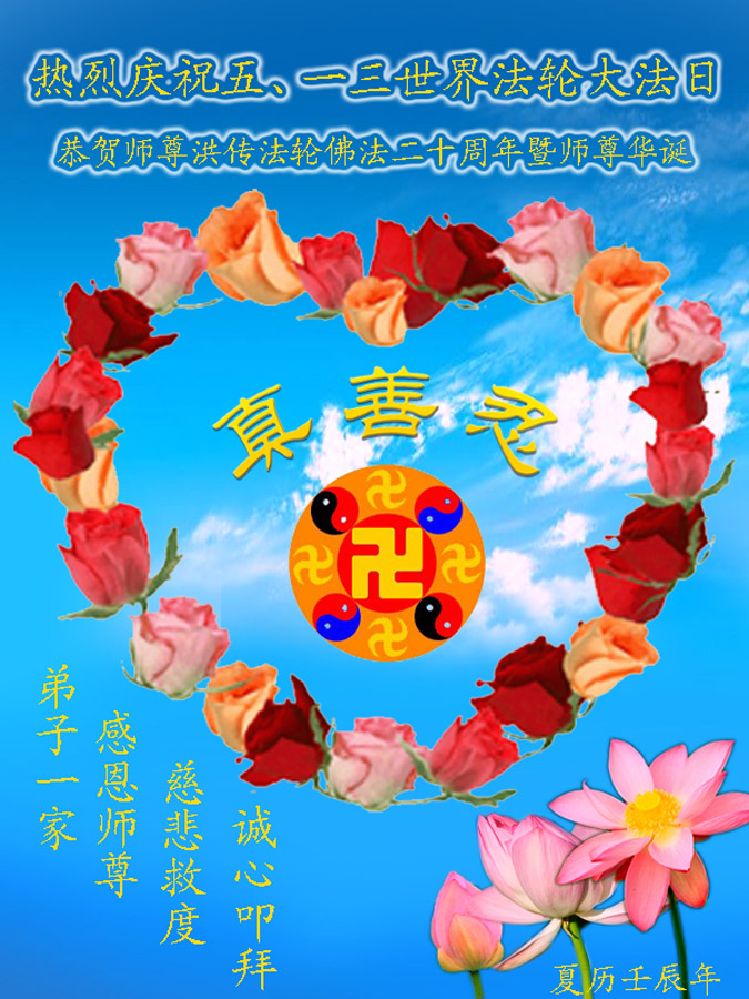 五月十三日——世界法轮大法日,在这个普天同庆、同祝同贺的日子里,我们一家四口向伟大的师尊问好,千言万语也无法表达对师尊的崇敬与感激!我们一家在这十三年的疯狂迫害中,历经重重魔难,在命悬一线之间,是师尊的慈悲呵护,使我们闯过了数次生死大关!十三年的巨难锤炼了大法弟子,弟子们一定精進的做好三件事,兑现自己的誓约,不辜负师尊的慈悲苦度。叩谢无上慈悲伟大的师尊!向伟大的师尊合十! 黑龙江省大庆市龙凤区大法弟子贺师尊华诞暨法轮大法日!