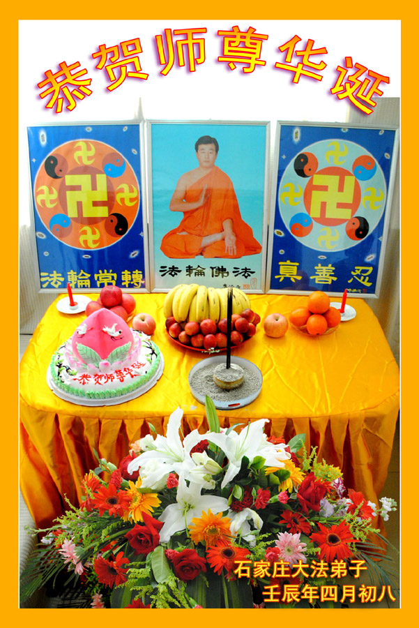 石家庄大法弟子跪拜师尊!感恩伟大的师尊把大法传于众生,感恩师尊从造新宇,感恩师尊赋予我们新生,千恩万谢唯有“感恩”。我们一定努力少让师父费心,按师父的要求做,尽快使自己成熟起来,做一个合格的正法时期大法弟子。 壬辰年四月初八 湖北省武汉汉阳一学法小组大法弟子恭祝慈悲伟大的师父生日快乐!