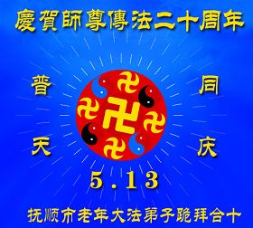 辽宁省抚顺大法弟子恭祝师尊生日快乐!祝贺全世界法轮大法日和大法洪传二十周年!