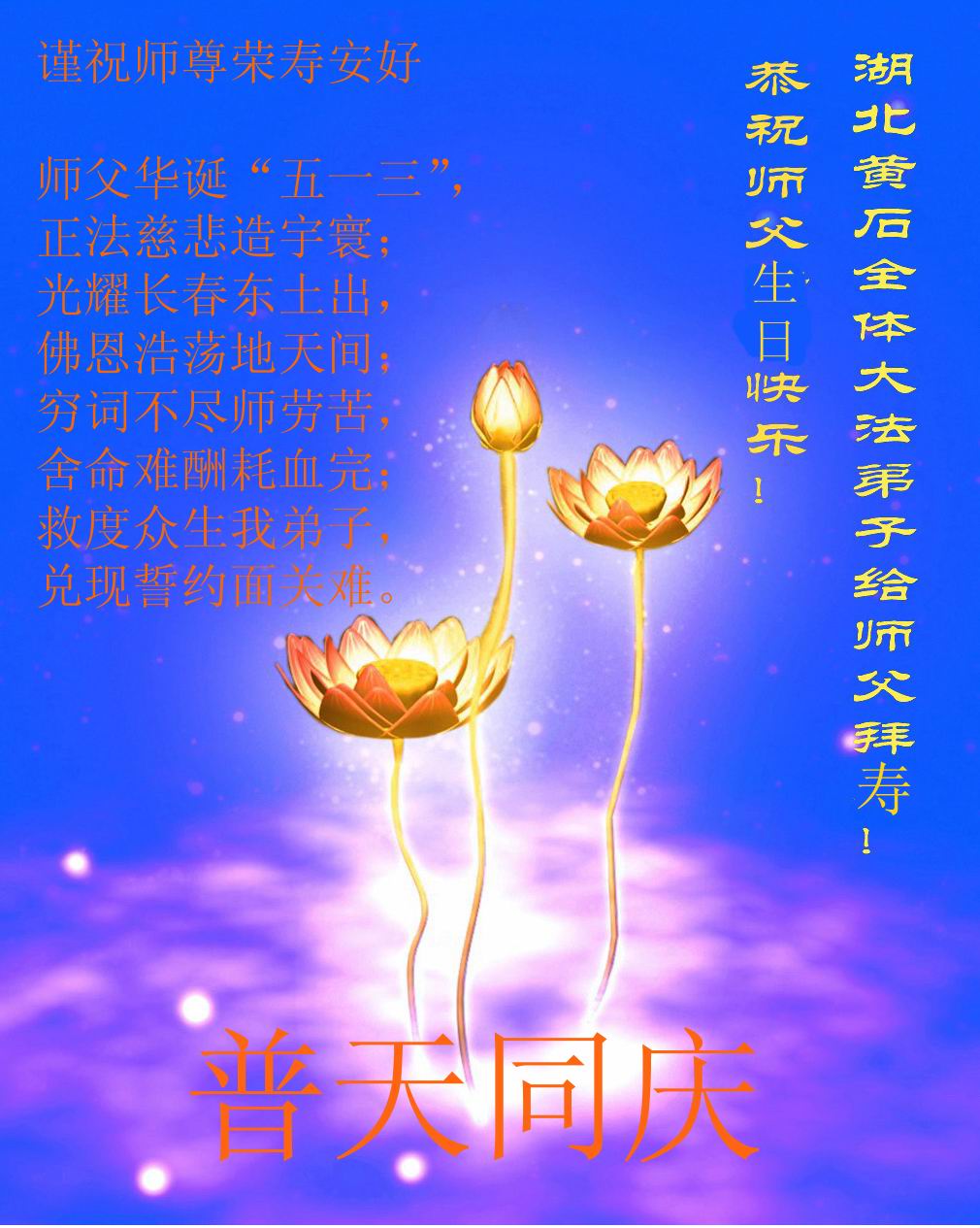 向慈悲伟大的师尊致以最崇高的敬意!祝师尊快乐! 湖北省黄石市全体大法弟子祝师父生日快乐!