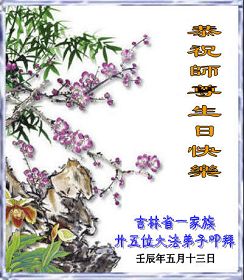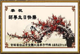 普天同庆、同颂。 请师父放心,我们一定修好自己,紧跟师父正法進程,助师正法,兑现誓约。 大陆大法弟子 辽宁省沈阳大法弟子全家人恭祝慈悲伟大的师尊生日快乐!