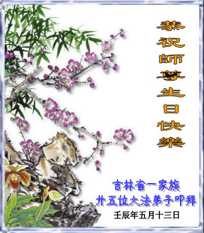 五月十三日是法轮大法洪传二十周年,也是全世界法轮大法日,同时又是师父诞辰之日,在这个特殊的日子我们全家六口人祝师父生日快乐! 河北霸州大法弟子 二零一二年五月一日 吉林市白山市全体大法弟子恭祝师尊生日快乐!