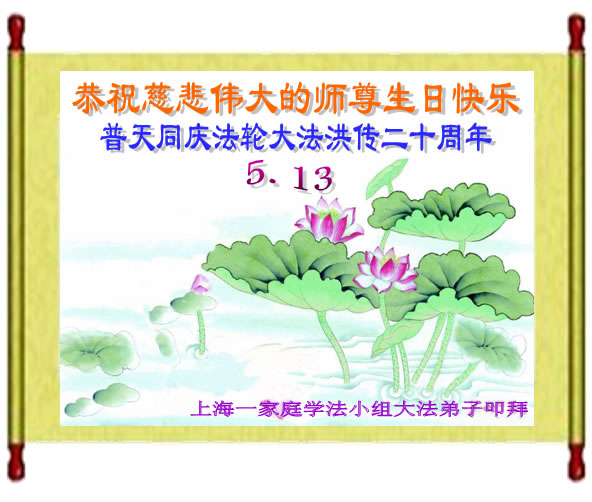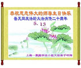 普天同庆世界法轮大法日! 慈悲伟大的师尊:您好!我们是江苏省常州市的一个修炼之家,在大法中精進实修,重获新生,师恩浩荡,师恩重,衷心感谢师尊的慈悲呵护和救度!我携全家及修炼的亲属共八人我们努力用心做好大法弟子应该做的三件事,助师正法,正念正行,救度更多的众生,兑现史前大愿,圆满随师还! 上海一学法小组大法弟子恭祝慈悲伟大的师尊生日快乐!普天同庆法轮大法洪传二十周年!