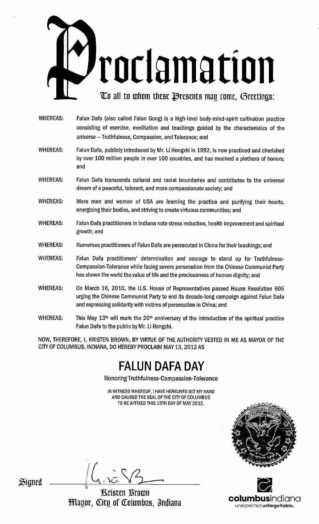 | 【明慧网二零一二年五月十二日】美国印第安纳州哥伦布市(Columbus, Indiana)市长克里斯汀•布朗(Kristen Brown)颁发褒奖令,褒奖法轮大法,宣布二零一二年五月十三日为法轮大法日,颂扬真、善、忍,并赞誉法轮大法修炼者面对中共残酷迫害仍坚持真善忍所表现出的决心和勇气。 褒奖译文如下: 印第安纳州哥伦布市 市长办公室 褒奖令鉴于,法轮大法(也称法轮功)是上乘性命双修功法,包括动功、打坐和基于真、善、忍宇宙特性的教导;而且 鉴于,法轮大法由李洪志先生于一九九二年公开传出,现已在一百多个国家洪传,上亿人修炼,广受赞誉;而且 鉴于,法轮大法超越文化和种族的界限,为建立一个祥和、忍让且更加包容慈善的社会所做出的贡献;而且 鉴于,越来越多的美国人正在学炼这个功法来纯净他们的心灵,增强他们的体质,努力创建良性社区;而且 鉴于,印第安纳州的法轮大法修炼者证实修炼法轮大法能减轻压力、增进健康、提高精神境界;而且 鉴于,在中国,大批法轮大法修炼者因他们的信仰被迫害;而且 鉴于,法轮大法修炼者面对中共残酷迫害仍坚持真善忍所表现出的决心和勇气,这向世界展现了生命的价值和人类尊严的可贵;而且 鉴于,二零一零年三月十六日美国国会众议院通过了第六零五号决议案。此决议案敦促中共当局停止对法轮大法的镇压运动,并对那些遭受迫害、甚至被迫害致死的法轮功学员及他们的家人表示同情;而且 鉴于,今年五月十三日是李洪志先生公开传法轮大法二十年纪念日。 鉴此,我,克里斯汀-布朗,凭借赋予我的印第安纳州哥伦布市市长的权力,特此宣布,二零一二年五月十三日为 法轮大法日 颂扬真、善、忍以资证明,签名为证并盖哥伦布市的印章 二零一二年五月十三日 克里斯汀•布朗 市长