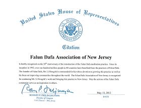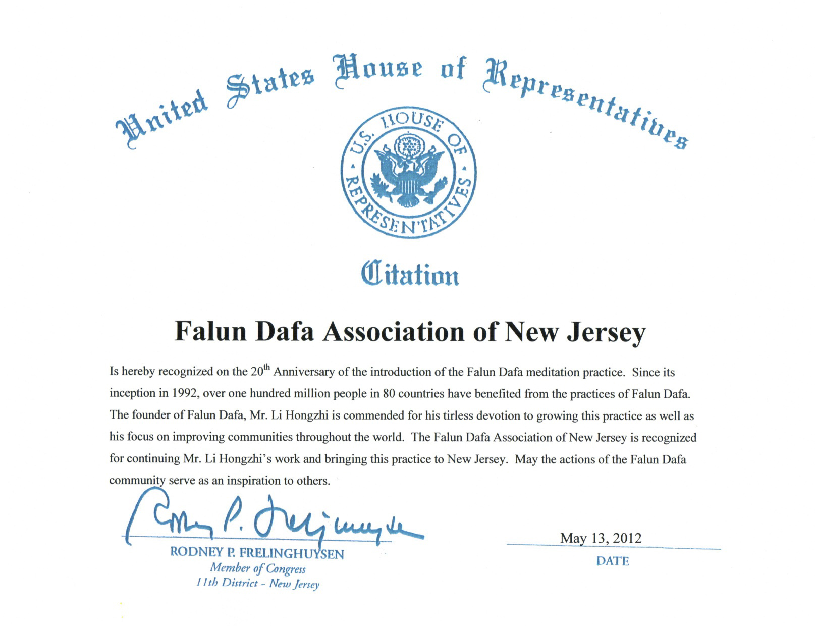 | 【明慧网二零一二年五月十二日】在法轮大法开传二十周年之际,美国新泽西州国会众议员罗德尼•弗瑞林汉森(Rodney Frelinghuysen)为新泽西法轮大法学会颁发国会表彰令。 表彰令译文如下: 在法轮大法这一修炼方法传播二十周年之际,特此认证。自一九九二年以来,八十个国家的超过一亿人从法轮大法的修炼中大获裨益。法轮大法的创始人,李洪志先生,也由于其对于功法推广的不懈努力以及对于提高社区福祉的专注广受称赞。而新泽西法轮大法学会由于继续向新泽西推广李洪志先生的教导和功法,而受到认可。祝愿法轮大法的活动能为他人带来启迪。 罗德尼•弗瑞林汉森 新泽西州第十一选区国会议员