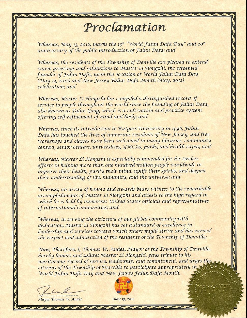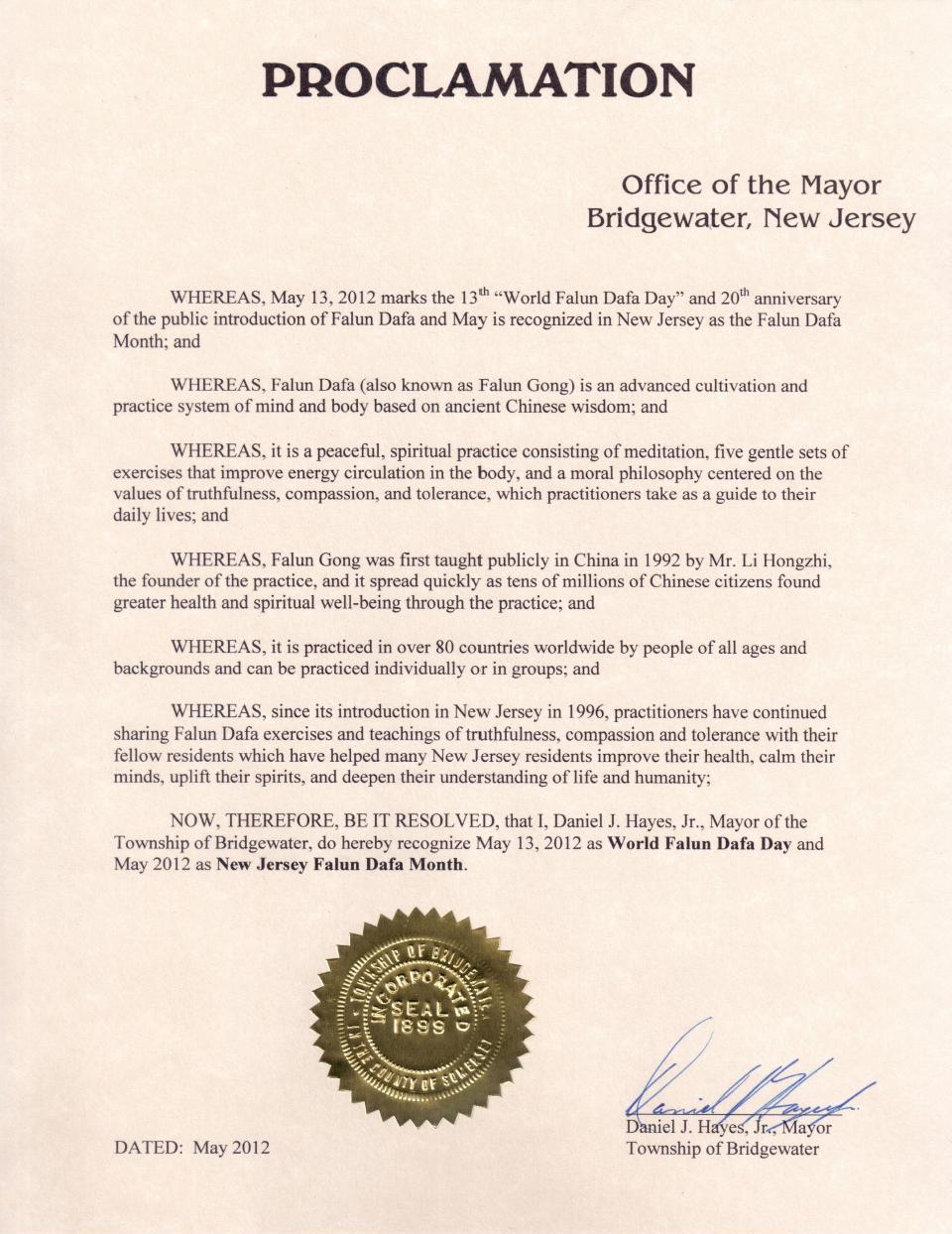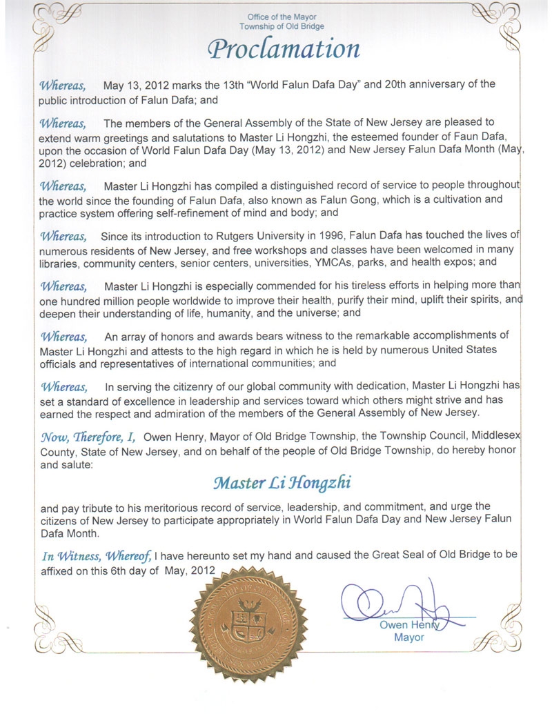 【明慧网二零一二年五月十二日】在第十三届“世界法轮大法日”和法轮大法洪传世界二十周年到来之际,美国新泽西州迄今已有十多个城市的市长发来褒奖或决议表彰和祝贺法轮大法。这些城市包括:桥水市(Bridgewater),爱迪生市(Edison),密尔本市(Millburn),莫里斯市(Morristown),老桥市(Old Bridge),帕西彭尼市(Parsippany),塞丽维尔市(Sayreville),瓦伦市(Warren),华盛顿市(Washington),丹维尔市(Denville)等。 桥水市市长发来的褒奖 |  爱迪生市市长发来的褒奖 |