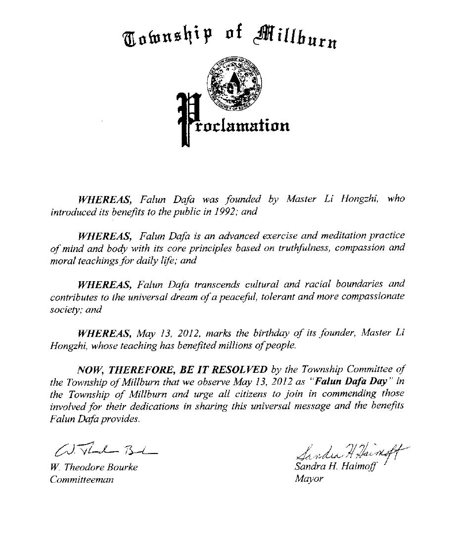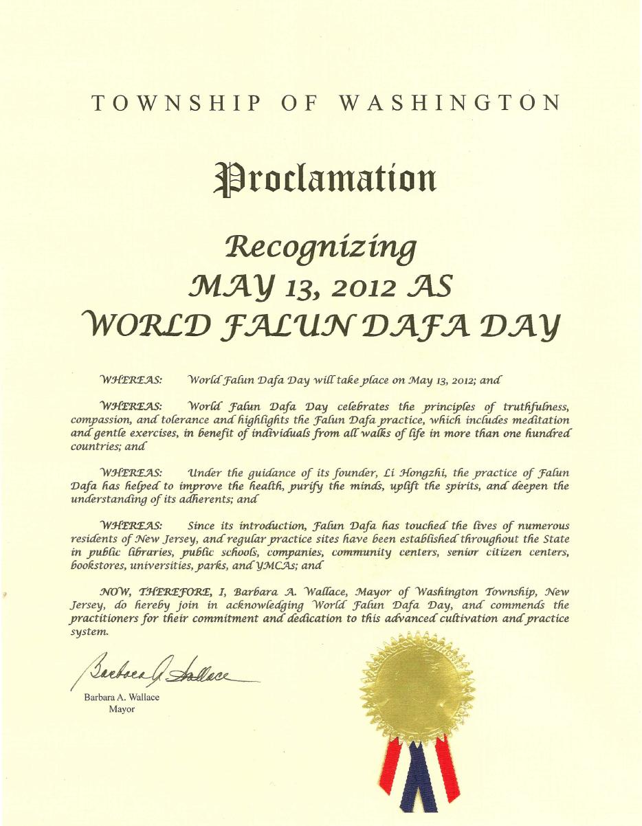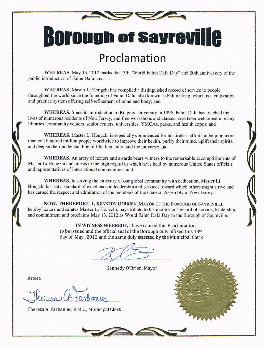 【明慧网二零一二年五月十二日】在第十三届“世界法轮大法日”和法轮大法洪传世界二十周年到来之际,美国新泽西州迄今已有十多个城市的市长发来褒奖或决议表彰和祝贺法轮大法。这些城市包括:桥水市(Bridgewater),爱迪生市(Edison),密尔本市(Millburn),莫里斯市(Morristown),老桥市(Old Bridge),帕西彭尼市(Parsippany),塞丽维尔市(Sayreville),瓦伦市(Warren),华盛顿市(Washington),丹维尔市(Denville)等。 桥水市市长发来的褒奖 |  爱迪生市市长发来的褒奖 |