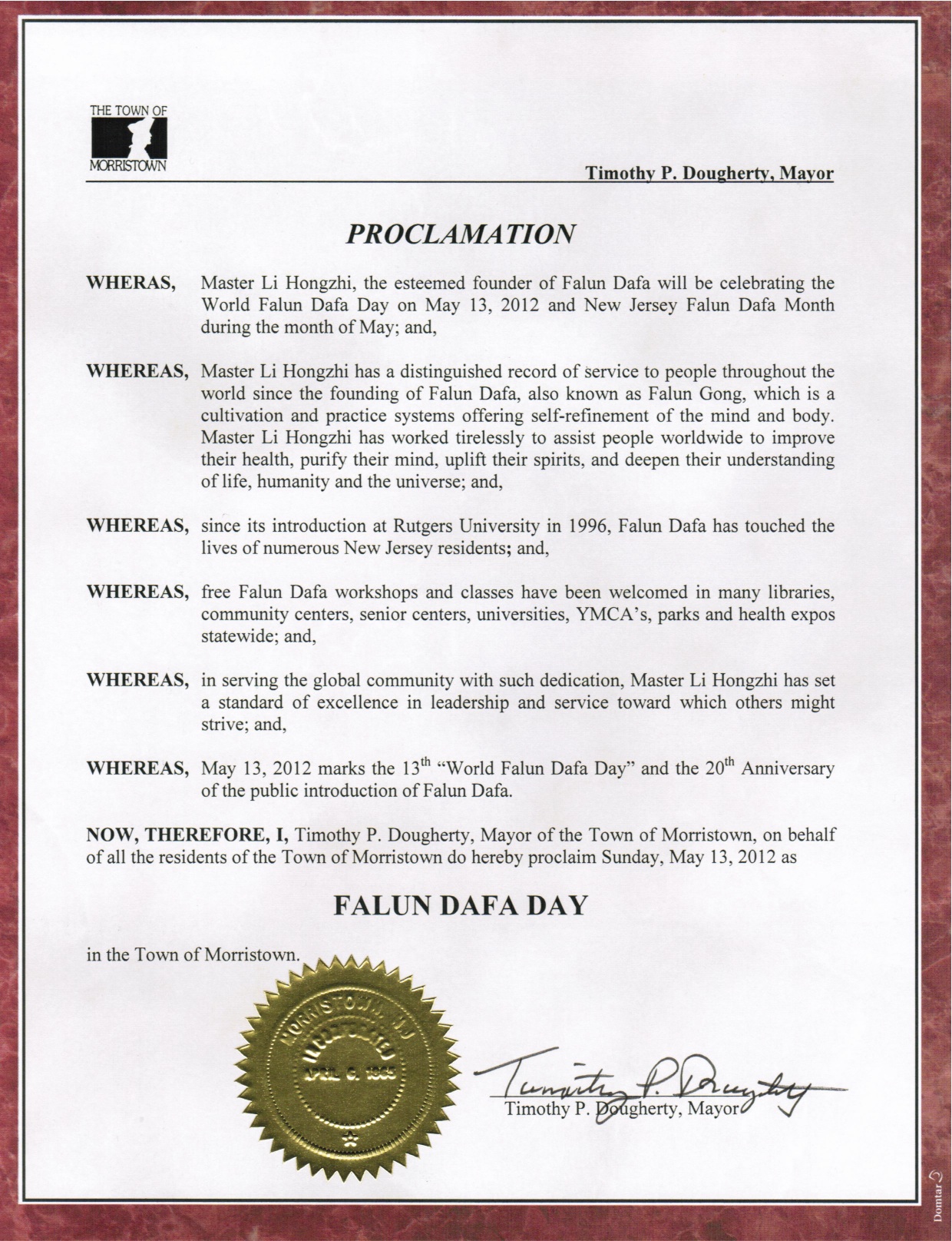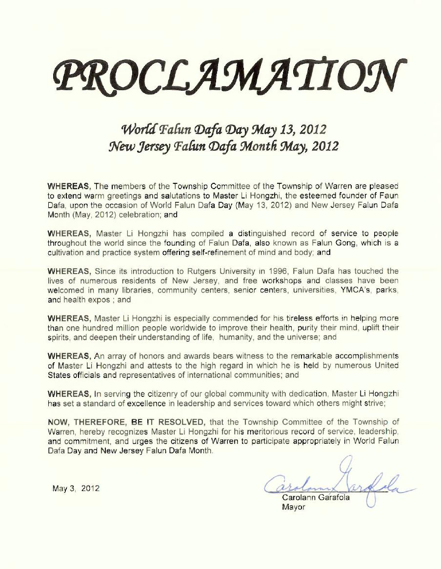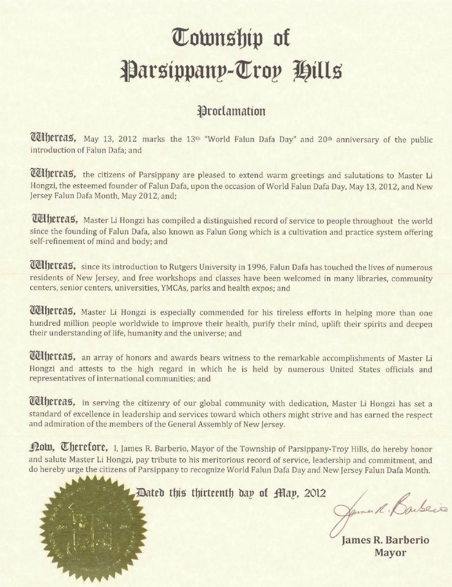 以下是部份褒奖的译文节选: 桥水市:法轮功有五套柔和的功法可以调节身体里的能量。是一项平和的精神上的运动。并且,法轮功修炼者都遵循真善忍为人生准则。自一九九二年由李洪志先生公开传出后,有一亿多人修炼。他们获得了身体上的健康和精神上的提升。 爱迪生市:市长代表爱迪生市,向法轮大法创始人李洪志大师致以最良好的祝愿。 密尔本市:法轮大法超越了文化和种族,对人们拥有和平、宽容和慈爱的社会的梦想作出了巨大贡献。 莫里斯市:自从一九九六年在罗格斯大学开始介绍法轮大法以来,法轮大法走进了许多新泽西居民的生活。法轮大法的免费讲座和课程遍及图书馆、社区中心、老年中心、大学、YMCA、公园、 健康博览会等。李洪志大师不知疲惫地帮助人们改进健康,净化心灵,提升人们的精神并且让人们对生命、人类和宇宙有了更深一层的了解。 老桥市:李洪志大师获得了许多来自美国政府和国际上的荣誉和褒奖,这证明了人们对他的贡献的肯定。 帕西彭尼市:帕西彭尼市的居民在世界法轮大法日非常喜悦地问候李洪志大师并向他致敬。 塞丽维尔市:市长Kennedy O’Brian 表彰李洪志大师,并向他致意。同时对李洪志大师的服务精神和领导力表达敬意。并宣布五月十三日为该市的法轮大法日。 瓦伦市:市长Caralann Garafola 表彰李洪志大师的服务精神和领导力,同时敦促该市市民参加世界法轮大法日和新泽西法轮大法月的活动。 华盛顿市:认同“世界法轮大法日”,并赞扬法轮大法修炼者对这一高层次修炼系统的专注和投入。 丹维尔市:借此庆祝世界法轮大法日和新泽西法轮大法月之际,丹维尔市居民向尊敬的法轮大法创始人李洪志大师致意和表达敬意。