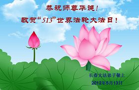 “五一三”是个神圣的日子。是世界瞩目、永远难忘的法轮大法日。这一天,慈悲伟大的师尊将佛法“真、善、忍”的光辉撒满苍宇,使众生沐浴在慈悲与威严同在的佛恩浩荡中。 转眼二十年了,这至高无上的法轮大法指引着我们一步一步的从迷蒙中醒来,成为众神都瞩目的大法徒。在这难忘的二十年中,我们俩俩相继而来,在师尊的慈悲呵护中清醒、成熟,正在履行自己的使命——救度众生。 我们知道:是师尊的无量付出(这是我们无法想象和永远也表达不了的),才有宇宙、众生的今天和希望。作为大法徒,我们就是要按照师尊的要求,做好三件事,不辱使命,不负师尊所望。 我们有千言万语想跟师尊说:师尊为我们付出的太多太多了,我们感恩师尊、感恩大法。在普天同庆法轮大法洪传二十周年的今天,我们一定按照师尊的要求做,学好法,多救人!跟师尊回家。 大连市沙区三个学法小组的大法弟子叩上 二零一二年五月九日 辽宁锦州一学法小组全体弟子恭贺师尊生日快乐!