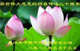 感谢师父的慈悲救度。普天同庆同贺5.13世界法轮大法日。祝贺大法洪传二十周年。 辽宁省大连市中心一学法小组弟子恭贺师尊生日快乐!并同祝世界法轮大法日暨法轮大法洪传二十周年!