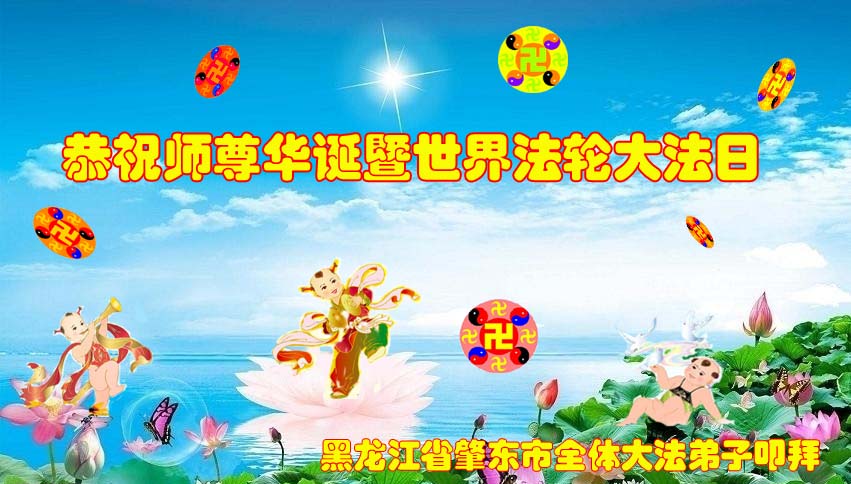 在这普天同庆同祝同颂的伟大光辉日子里,我们深感佛光普照、洪恩浩荡。幸遇这万古机缘,成为大法弟子,助师正法,感到无比荣耀和自豪。无限感恩伟大师尊的慈悲救度和巨大承受与呵护,真是无以为报,只有精進实修,紧跟正法進程,学好法,发好正念,救度更多众生,让师尊多一点欣慰,少一点操劳。虔诚的叩拜师尊!师尊啊!弟子们多么想念您啊,这是大陆所有大法弟子们的心声!期盼与师尊早日团聚,回归美好的家园 黑龙江省佳木斯大法弟子恭贺师尊生日快乐!恭祝法轮大法洪传二十周年!