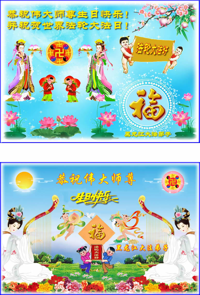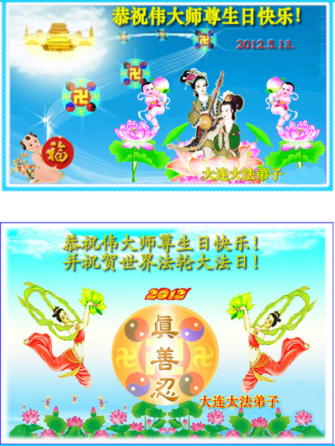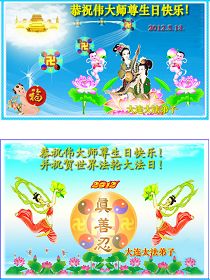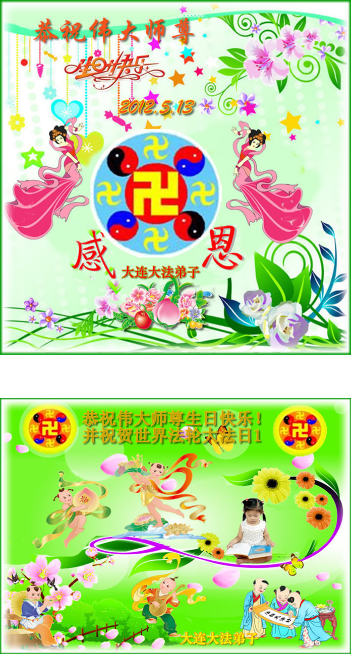 | 【明慧网二零一二年五月十二日】二十年前的五月,李洪志师父在中国长春将法轮大法公开传出于世,二十年后的今天,法轮大法洪传全球,亿万修炼者在大法“真善忍”的指导下道德升华,获得身心健康。十三年来,每年的五月十三日,世界各地的法轮大法弟子,都向明慧网寄来贺卡贺词,庆祝“世界法轮大法日”,恭贺师尊华诞。这里是明慧编辑部已整理出来的部份来自中国大陆东北地区大法弟子的贺卡、贺信。