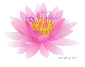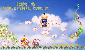 我们一定听师父的话,精進实修,做好三件事,在这最后有限的时间里,抓紧救人,请师尊放心。 二零一二年五月九日 辽宁阜新一学法小组大法弟子恭贺师尊华诞暨世界法轮大法日!