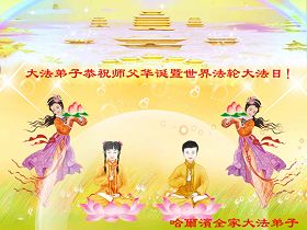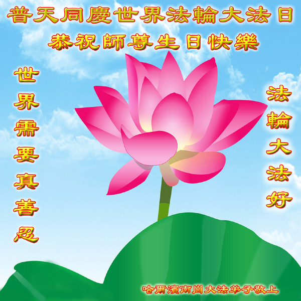 弟子们一定加倍努力,做好三件事,修好自己、救度更多的众生。 黑龙江省哈尔滨大法弟子恭祝慈悲伟大的师尊生日快乐!恭贺世界法轮大法日!