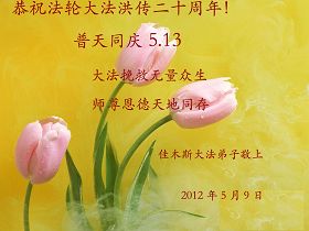 在5月13日这个永载人类史册最辉煌的盛大节日到来之际,大连大法弟子以无限感恩之情,恭祝慈悲伟大的师尊生日快乐!师父您辛苦了! 您“为救大穹传大法,众生业债一身当,无量众业成巨难,青丝斑白人体伤”。对您的巨大付出,慈悲救度与一路呵护,弟子无以回报,唯有听师父的话,加倍努力做好“三件事”,勇猛精進,随师把家还。 大连大法弟子 二零一二年五月九日 黑龙江省佳木斯大法弟子恭贺法轮大法洪传二十周年!