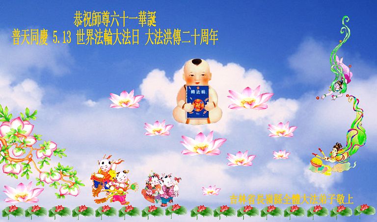感谢师尊对弟子的慈悲苦度。 吉林市大法弟子一家祝师尊生日快乐!暨世界法轮大法日!