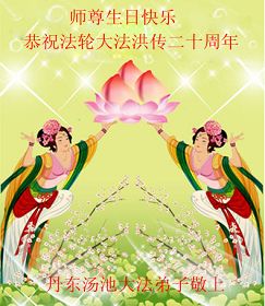 今年五月十三是慈悲伟大的师尊六十一岁华诞日,也是师尊盛传宇宙大法二十周年之时,在这“五一三世界法轮大法日”之际,我们衷心的祝贺师尊,恭祝您生日快乐! 辽宁省丹东汤池大法弟子恭祝师尊生日快乐!