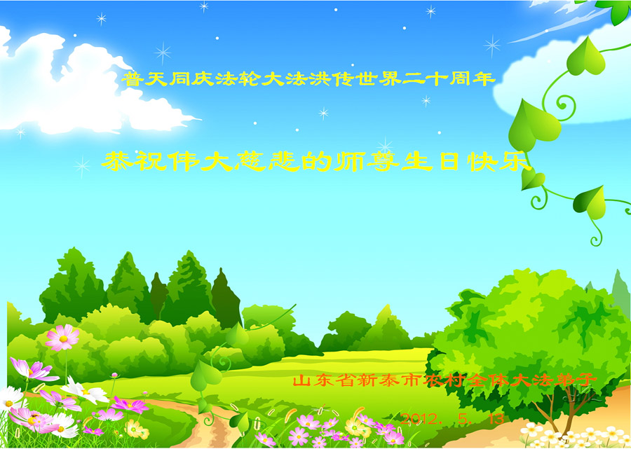 山东省泰安市新泰市农村全体大法弟子恭祝伟大慈悲的师尊生日快乐!普天同庆法轮大法洪传世界二十周年!