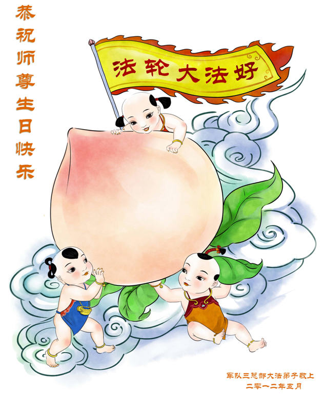 师尊华诞天地欢 笙歌曼舞法轮旋 正法洪势来人间 天清体透换新颜 大法弟子亿千万 助师正法真相传 江鬼红魔一朝灭 手捧净莲迎师还 北京军队四总部一炼功点全体大法弟子敬上 二零一二年五月 江苏省南京军区全体大法弟子及其家属恭祝师尊生日快乐!