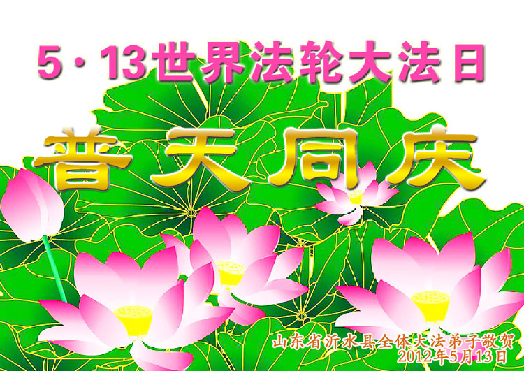 【明慧网二零一二年五月十二日】二十年前的五月,李洪志师父在中国长春将法轮大法公开传出于世,二十年后的今天,法轮大法洪传全球,亿万修炼者在大法“真善忍”的指导下道德升华,获得身心健康。十三年来,每年的五月十三日,世界各地的法轮大法弟子,都向明慧网寄来贺卡贺词,庆祝“世界法轮大法日”,恭贺师尊华诞。这里是明慧编辑部已整理出来的部份来自中国大陆华东地区大法弟子的贺卡、贺信。 山东省临沂市沂水县全体大法弟子庆法轮大法洪传世界二十周年并祝慈悲伟大的师尊生日快乐