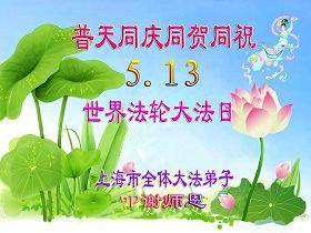 在大法洪传二十周年到来之际,在普天同赞同颂同庆的五一三“世界法轮大法日”到来之时,我们枣庄大法弟子倍加想念师尊!请师尊放心,弟子一定谨记师尊的教诲,不忘肩负的重任,坚定的走正走好师尊给弟子安排的修炼的路。多学法、学好法,修好自己,多救众生,整体配合好。彻底解体一切邪恶,早日随师回家! 上海大法弟子恭祝师父生日快乐暨世界法轮大法日!
