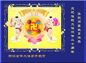 浙江省宁波大法弟子恭祝慈悲伟大的师尊生日快乐!感谢师尊慈悲救度!庆祝大法洪传二十周年!与全世界大法弟子同庆“世界法轮大法日”!