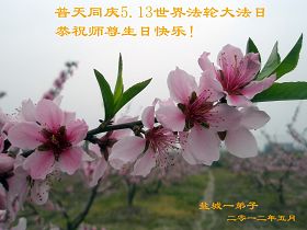我是山东省潍坊地区的一名大法弟子。在这普天同庆、大法洪传世界二十周年到来的大好日子里,在此庆祝“五一三”世界法轮大法日的到来;恭贺慈悲伟大的师尊生日快乐!道一声:师尊您辛苦了! 自己得法修炼十几年来,由于人心执著与惰性的牵绊没能好好珍惜这亘古不遇的大法修炼机缘,没有做到自始至终勇猛精進的修炼。由于邪恶的迫害,自己没有做到正念正行,曾摔了大跟头,走过弯路。就这样,慈悲的师尊仍时时呵护、点化我这个不争气的弟子,一拉再拽。在我准备写信恭贺师尊生日快乐时,心中满满全是感念师尊救度之情,言不尽,语难诉。从未写过诗的我竟然很快作出了两首诗。在此献上以表达弟子感恩师尊苦度之情,同时鞭策自己今后要以法为师,精進实修。 得 度 法轮圣王行在世 大法洪传撒甘露 痴迷众生渐醒悟 心存良知得救度 精 進 法徒精進读金篇 师尊教诲记心间 救度众生三件事 下世誓约定兑现 山东潍坊大法弟子 二零一二年五月九日 山东省滨州市滨城区滨北大法弟子恭祝慈悲伟大的师尊生日快乐!同贺同颂法轮大法洪传世界二十周年!