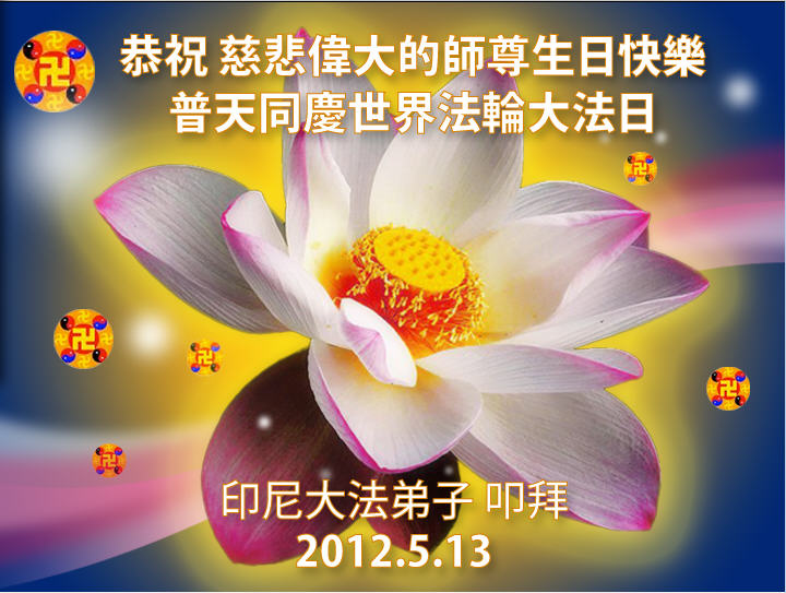 庆贺法轮大法洪传二十周年 师传大法二十载 历尽艰辛为众生 感恩此生获得度 弟子跪拜谢师恩 用心做好三件事 助师正法救世人 唯有精進再精進 但愿师尊笑开颜 湖南省冷水江市全体大法弟子 印尼大法弟子恭祝慈悲伟大的师尊生日快乐!普天同庆世界法轮大法日!