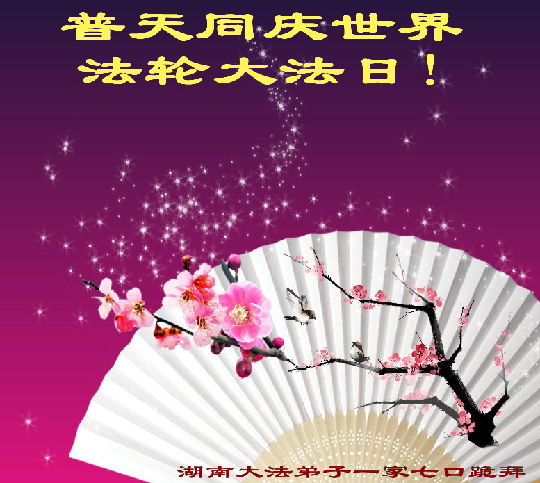 湖南大法弟子一家七口恭祝伟大师尊生日快乐!同贺世界法轮大法日暨法轮大法洪传二十周年!