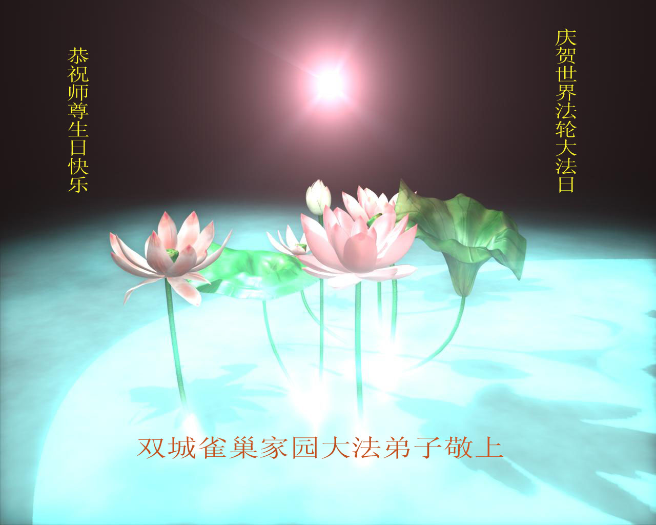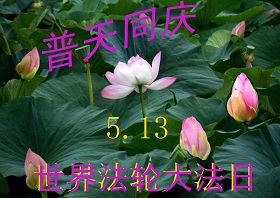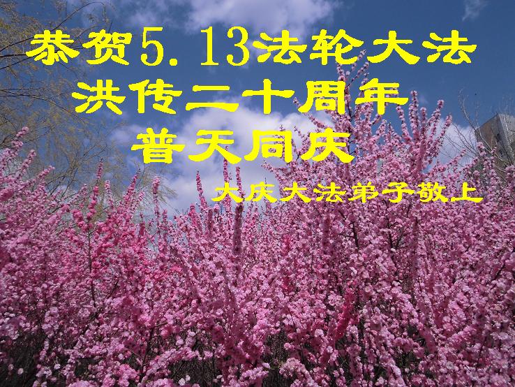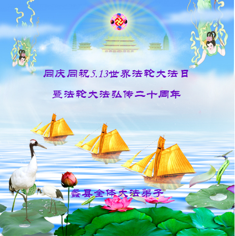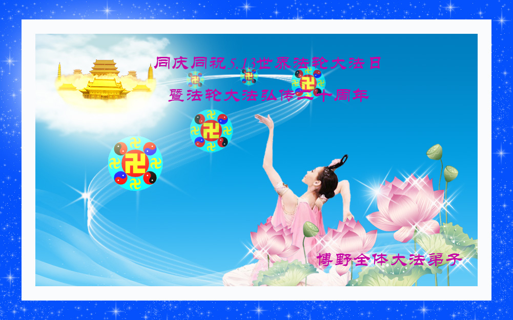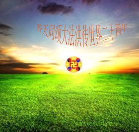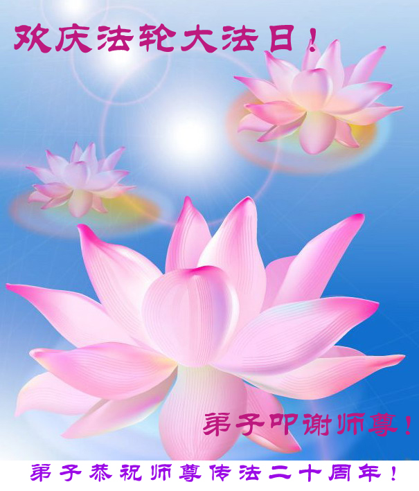 值此法轮大法洪传二十周年之际,我们身居中国东北部的边陲小镇,通过网络表达对师尊的感恩与思念。此时此刻,内心的喜悦和激动与对师尊的感激、叩谢无以言表……二十年来,多少风雨沧桑、多少艰难岁月、多少辛酸苦难、多少荆棘坎坷、多少腥风血雨伴随着我们一路走来,是伟大的师尊无微不至、无所不在的慈悲与呵护才使我们走到今天。回过头来,真是别有一番感慨,千言万语也无法表达师尊的慈悲浩荡!唯有做好三件事,跟上正法進程,早日实现遍地开花,救度更多的众生。在这值千金值万金的最后时刻,不懈怠、不涣散、不麻木,找回修炼如初的状态,意如金刚,坚如磐石,坚定实修到最后,兑现自己的洪誓大愿! 大法弟子普天同庆世界法轮大法日!