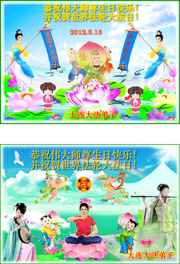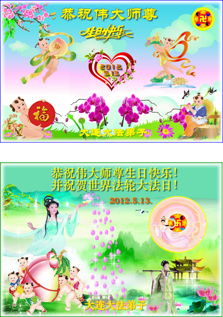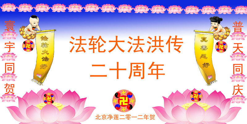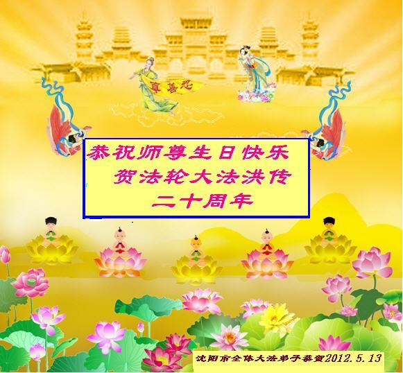 二十年我们风雨同進,二十年我们携手同行,二十年我们有过欢笑、有过泪水;师尊的苦心救度让我们了解了自己为何来世间,洪传大法与讲清真相的责任我们担在肩;面对打压与迫害我们没有退缩,没有仇恨,只有对世人的慈悲救度讲真相,并把真理传遍了宙宇之间;二十载的修行让我们得到了常人想得都无法得到的一切;衷心感谢慈悲伟大的师尊!在此恭贺法轮大法洪传二十周年!恭贺世界法轮大法日!大连一大法小弟子恭贺二零一二年五月七日 山东德州两个学法小组大法弟子祝我们伟大慈悲的师父生日快乐!