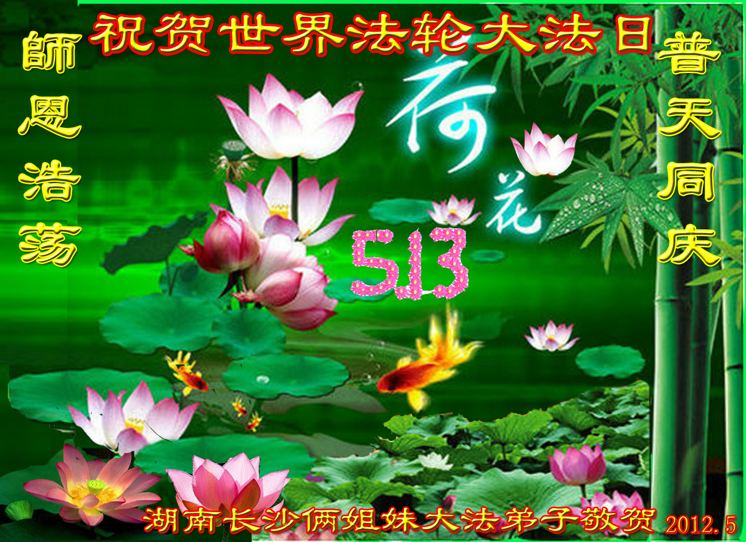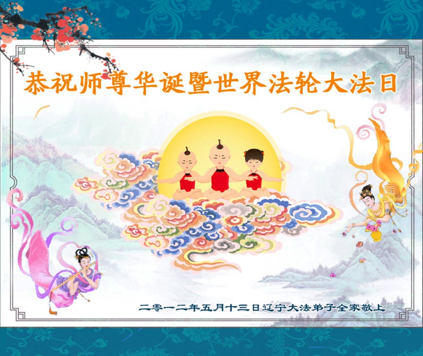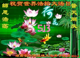 二零一二年五月十三日,是我们慈悲无私的师尊洪传法轮大法二十周年的辉煌节日,在这普天同庆的盛大感恩的日子里,我们每个大法弟子都有一颗无限感恩的心,无限感恩师尊的慈悲救度,无限感恩法轮大法的洪传,无限感恩大法赐予我们的无边恩惠。无限感恩师尊赐予我们新的未来。抓紧这最后剩下的不多的时间,救度更多的众生,兑现我们史前的誓约,真正配得上正法时期大法弟子的伟大称号!真正配得上是慈悲无私师尊的弟子! 大庆大法弟子敬上 2012.05.07。 辽宁鲅鱼圈全体大法弟子恭祝慈悲伟大的师尊生日快乐!同贺5.13世界法轮大法日!