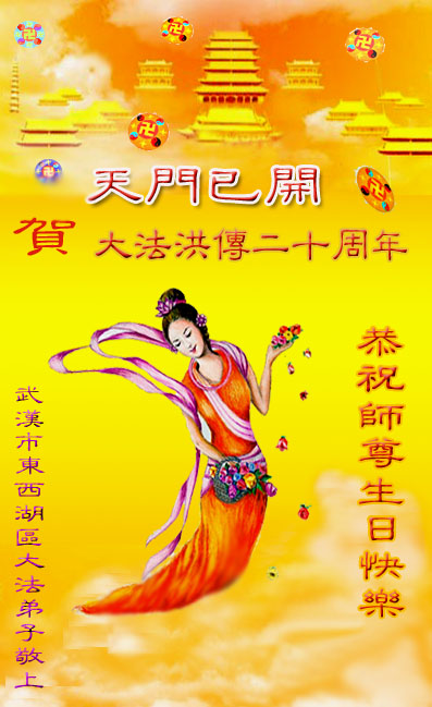 感谢伟大的师尊慈悲苦度!我是九九年之前有幸得法,由于自己学法不深,九九年迫害发生后,一时不知所措,一步步滑向罪恶的深渊。是慈悲的师父没有放弃我这个不争气的弟子,多次在梦中点化,在同修的帮助下,零九年又重新走回来。通过系统学法,明白了正法时期的大法弟子神圣使命,是做好“三件事”,助师正法,兑现自己史前大愿!我一定要静心学法,学好法,修去自己色欲心、名利心、怕心、不能被人说的心等等许许多多常人之心,做好“三件事”,圆满随师还! 湖北省武汉市东西湖区全体大法弟子恭贺大法洪传二十周年!恭祝师尊生日快乐!