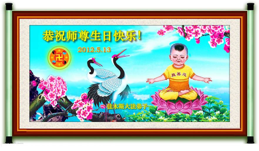 慈悲伟大的师尊:您好! 五月十三日是世界法轮大法日和您的诞辰日,众弟子们用无限感恩和敬仰的心,遥祝师尊生日快乐! 这十三年邪恶对大法与大法弟子的残酷迫害,在师尊您的承受,呵护下弟子们才能走到今天。在正 法的最后阶段,我们不被常人社会形式带动,就听师尊的话做好三件事。遇事向内找,相互配合好,做到整体提高,整体升华。救度更多的众生 ,不辜负师尊的殷切希望 ,兑现自己史前誓约,听师尊的话,走正回归路。 弟子们叩拜! 佳木斯市和平社区学法小组 二零一二年五月六日敬上 天津大法弟子恭祝伟大慈悲的师尊华诞快乐!庆祝法轮大法洪传世界二十周年!