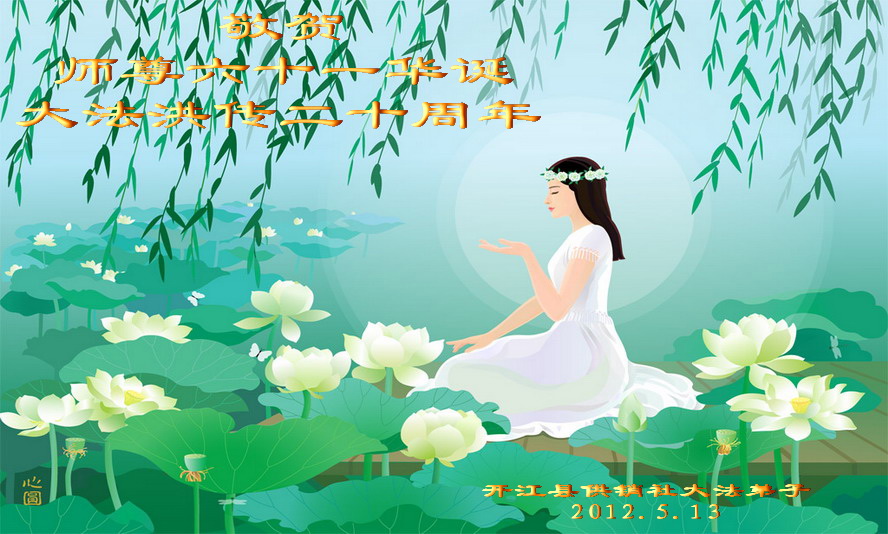 祝伟大的师尊生日快乐,师尊您辛苦了,我们一定做好三件事,不负师尊慈悲救度。 山东聊城安保系统大法弟子敬祝 2012年5月10日 河北张家口蔚县大法弟子一家恭贺师尊华诞!祝贺“世界法轮大法日”!