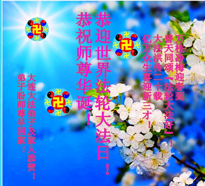 辽宁省大连学法小组全体学员恭祝师尊生日快乐,恭祝法轮大法洪传二十周年。