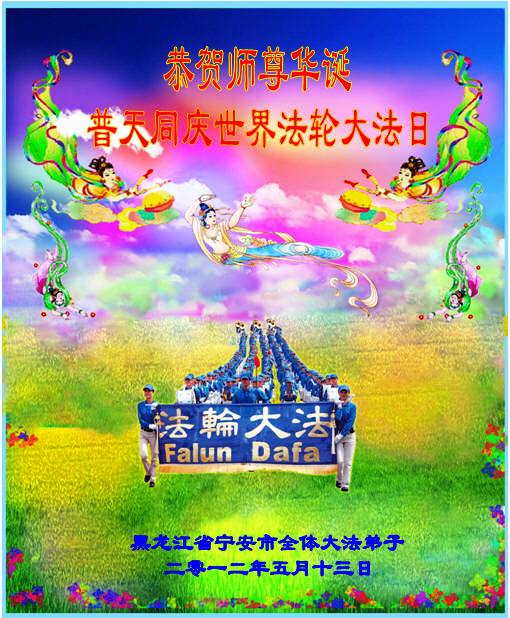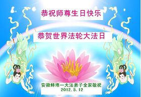 在这普天同庆同 祝的神圣日子里,我们衷心祝愿师父健康快乐!弟子们一定更加努力做好“三件事”,精進实修,慈悲救度更多众生,多给师父一些欣慰。 二零一二年五月十日 黑龙江省佳木斯市桦南县全家大法弟子恭贺师尊生日快乐!喜迎“世界法轮大法日”!