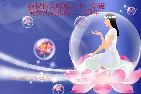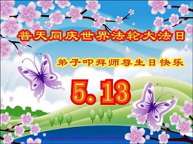 在弘扬法轮大法二十周年之际暨五一三世界法轮大法日,河北张家口大法弟子全家感谢师尊慈悲呵护,恭祝师尊生日快乐。 辽宁省沈阳大法弟子庆祝师尊传法二十周年,恭祝慈悲伟大师尊生日快乐