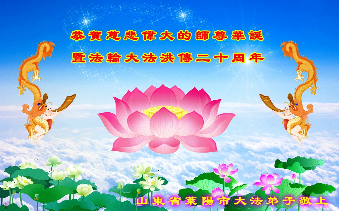 恭贺法轮大法日,叩拜师尊生日快乐! 山东省烟台市莱阳市大法弟子恭贺师尊生日快乐