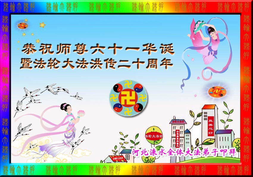 山东省莱阳市大法弟子恭贺师尊生日快乐、恭贺法轮大法洪传二十周年! 河北省保定市涞水县全体大法弟子恭祝慈悲伟大的师尊生日快乐